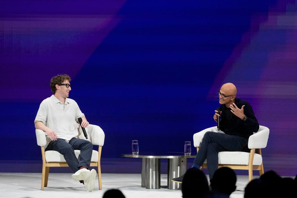 2025年4月29日,微软CEO萨提亚·纳德拉(右)在加州门洛帕克举行的LlamaCon 2025大会上与Meta创始人马克·扎克伯格交谈。图片来源:美联社