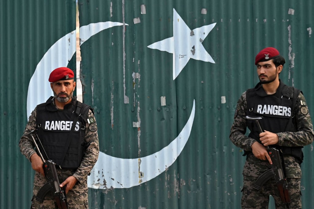周三印度对距拉合尔约30公里的穆里德克发动空袭后,巴基斯坦政府大楼外驻守的准军事部队士兵。图片来源:法新社
