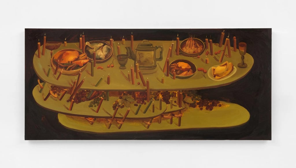这里可能是她(慈禧)的客厅,也可能是她举办无数盛宴的餐厅。《御宴菜单II》(2025)描绘了三层餐桌上铺陈的珍馐美馔。蜡烛穿透桌板,被细小手臂托举着,象征操办这场盛宴所需的层层劳力。这也暗合慈禧的宫廷晋升之路——初入宫时身处底层,最终攀至权力巅峰。