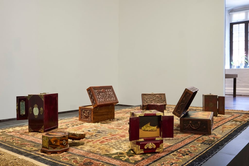 这块地毯是直通1850年代的时空纽带——我们此刻正置身于那个年代的物理空间。雕花木首饰盒常被当作结婚贺礼,部分盒面烫金的"囍"字正是明证。盒中藏着更具诱惑力的小幅油画,它们来自eBay、Etsy和Craigslist等平台,有些是古董,有些则是当代制品。