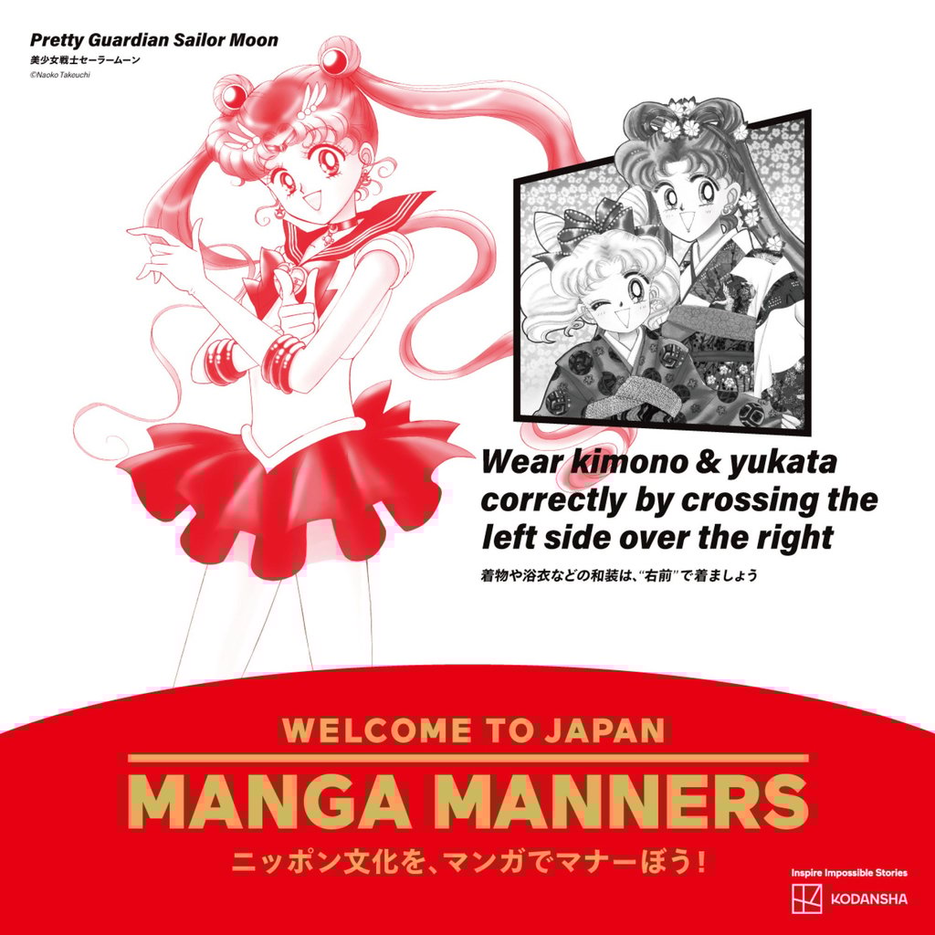 每张"漫画礼仪"海报都印有《美少女战士》《妖精的尾巴》《进击的巨人》等漫画明星角色,并附有提示信息,恳请外国游客遵守规则,确保在日本获得更安全愉快的旅程。例如,《美少女战士》主题海报会指导在京都租借和服的女性游客"正确穿着和服与浴衣,注意左襟压右襟"。