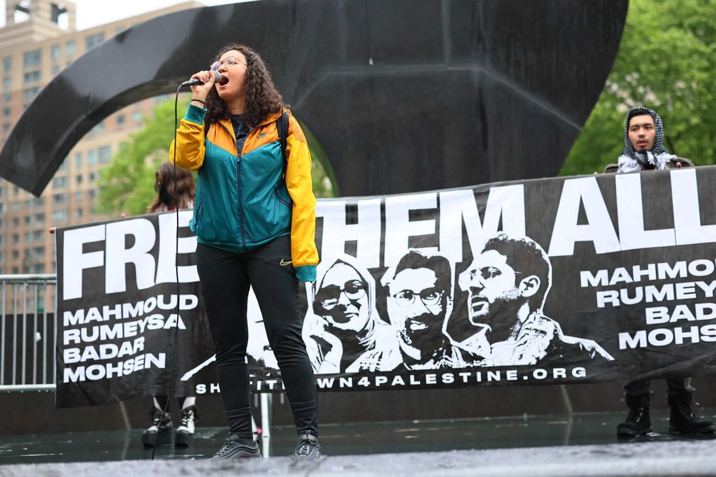 周二纽约民众集会声援塔夫茨大学学生鲁梅萨·奥兹图尔克和哥伦比亚大学活动人士莫森·马赫达维。摄:法新社