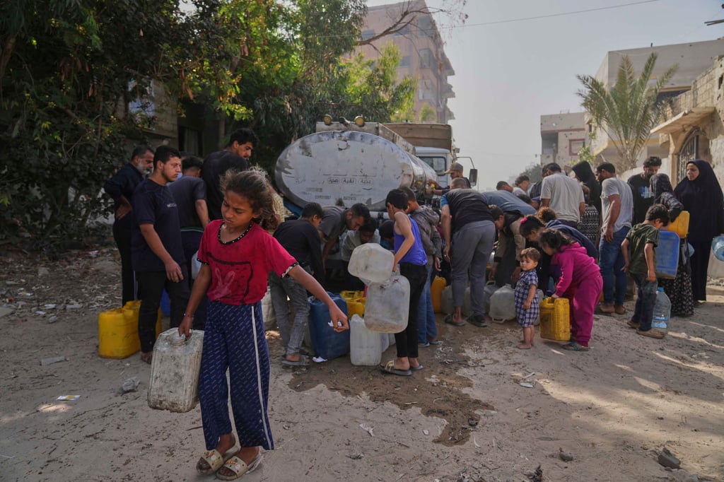 周日,巴勒斯坦人在加沙城西部的分发点用塑料桶取水。图片来源:美联社