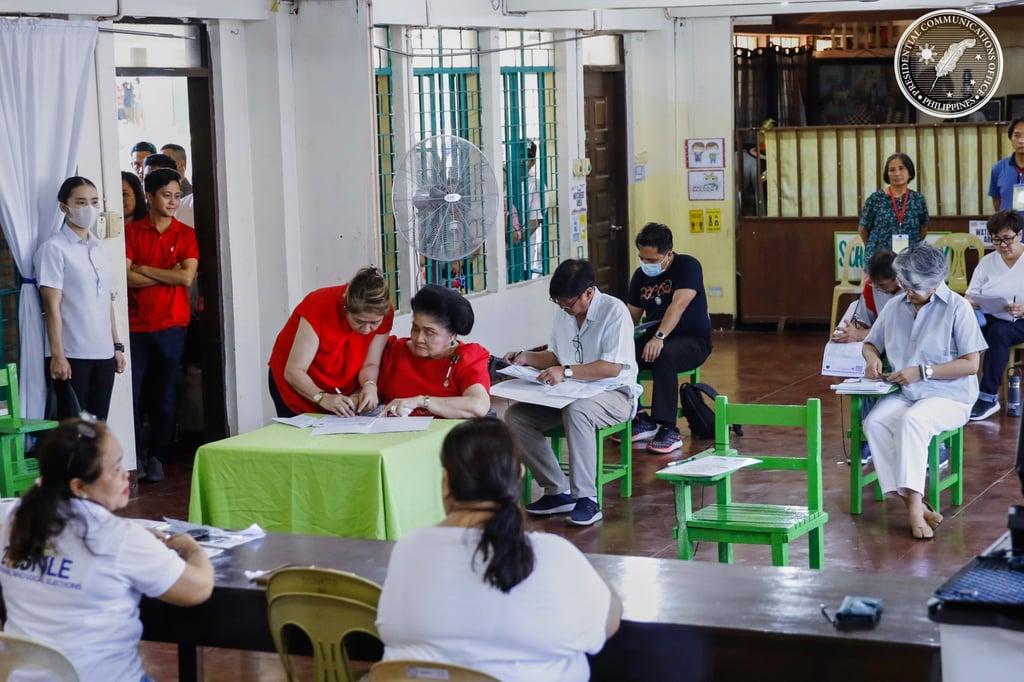 菲律宾总统小费迪南德·马科斯(中右)和他的母亲、前第一夫人伊梅尔达·马科斯(中左)周一在北伊罗戈省巴塔克市的一个投票站准备投票。照片:美联社
