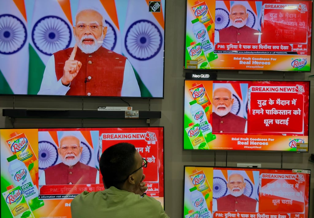 周一,在印度北方邦的普拉亚格拉杰,一名男子正在电视屏幕上观看印度总理纳伦德拉·莫迪的演讲直播。照片:美联社