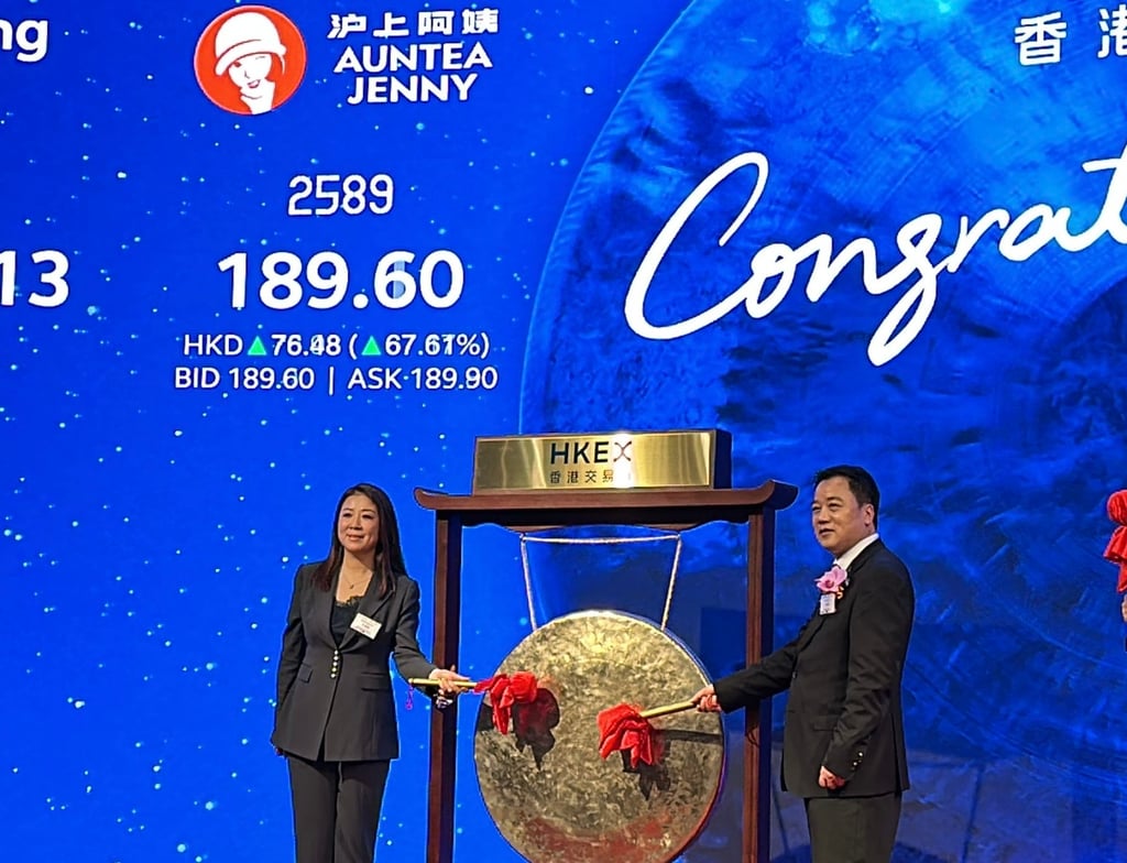 阿姨茶珍妮的联合创始人兼董事长单伟军(右)在2025年5月8日公司于香港交易所的上市仪式上。照片:Aileen Chuang