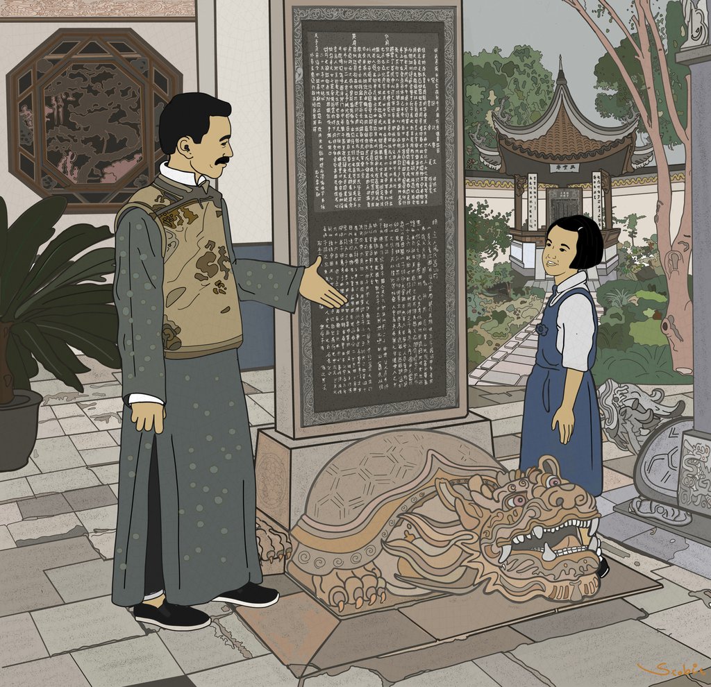 吴健雄的父亲带年幼的吴前往妈祖庙了解郑和的故事。插图:塞缪尔·波蒂厄斯
