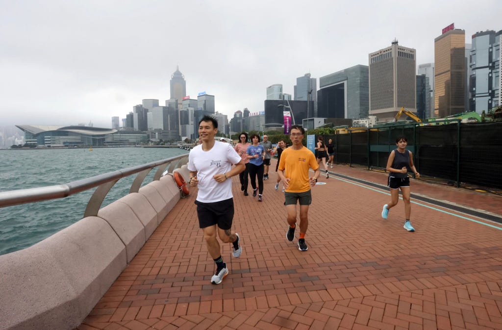 这是一个细雨蒙蒙、阴云密布的周六早晨,在香港中环海滨长廊,尽管阵风不断,仍有许多跑者在此训练。
