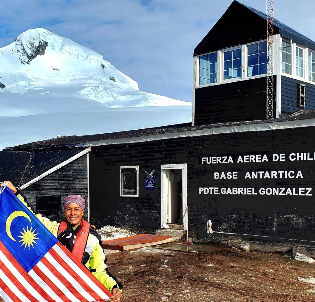 安妮塔·尤索夫在南极洲挥舞马来西亚国旗。照片:安妮塔·尤索夫提供