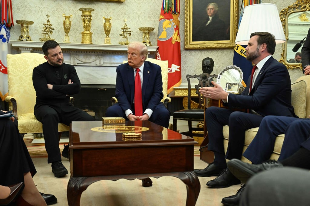 2月28日,美国总统唐纳德·特朗普与乌克兰总统弗拉基米尔·泽连斯基在华盛顿白宫椭圆形办公室会晤时聆听副总统J.D.万斯(右)发言。图:法新社