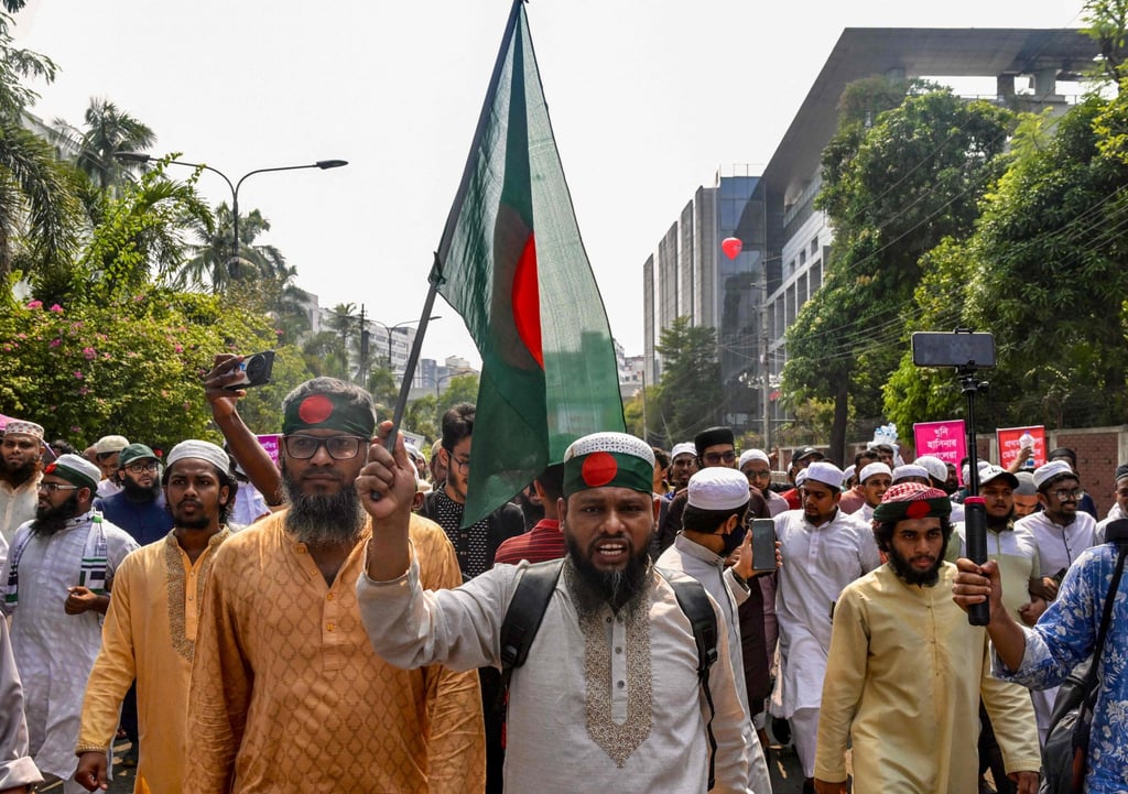 5月9日,抗议者聚集在达卡的国家宾馆贾木纳(孟加拉国看守政府首席顾问穆罕默德·尤努斯官邸)附近,要求取缔被罢黜的谢赫·哈西娜所属的人民联盟。图:法新社