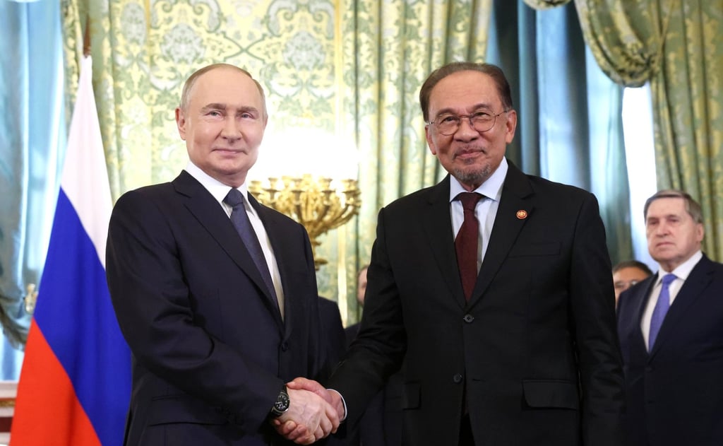 周三,马来西亚总理安瓦尔·易卜拉欣(右)在克里姆林宫受到俄罗斯总统弗拉基米尔·普京的欢迎。照片:克里姆林宫/德新社