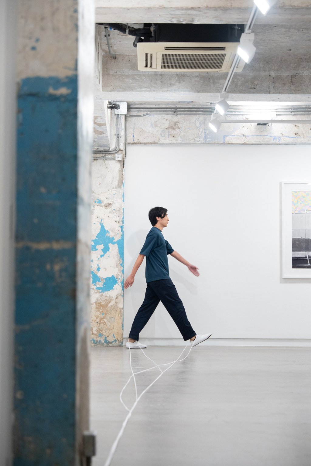 他脚踩一双用百米长鞋带交错系住的纯白基础款运动鞋,以仿军事化步伐昂首阔步穿梭于黄竹坑盲人影像馆,身后拖曳的白色长绳在拥挤展厅划出蜿蜒轨迹。