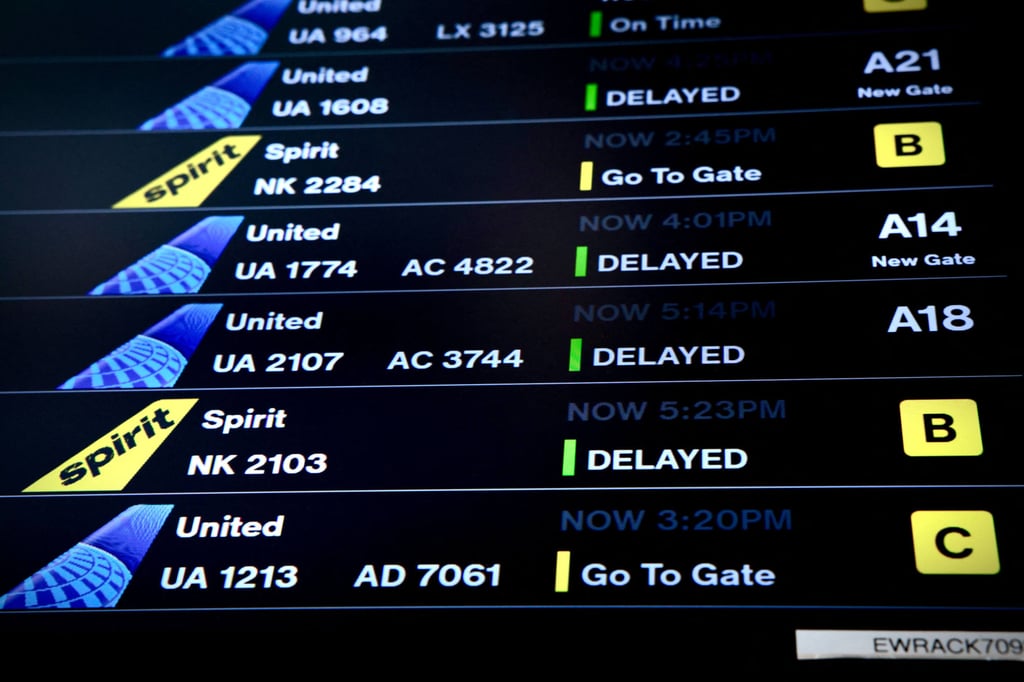 5月7日,新泽西州纽瓦克自由国际机场显示航班信息的电子屏。图:法新社