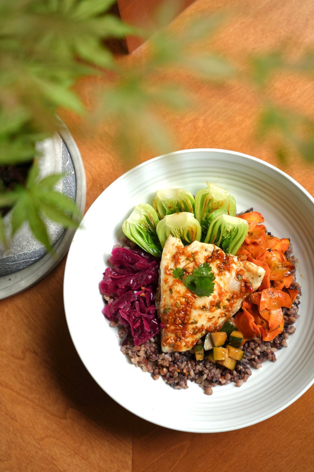 Nute的Gróa餐厅提供的韩式辣酱市场鱼片配杂粮、小白菜和墨西哥辣椒酸菜。照片来源:Nute的Gróa餐厅