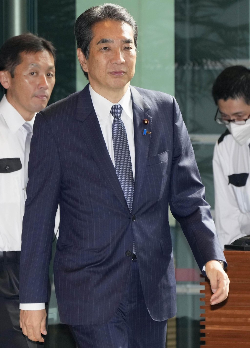 日本农林水产大臣江藤拓周三在东京进入首相石破茂的办公室提交辞呈。照片:共同社
