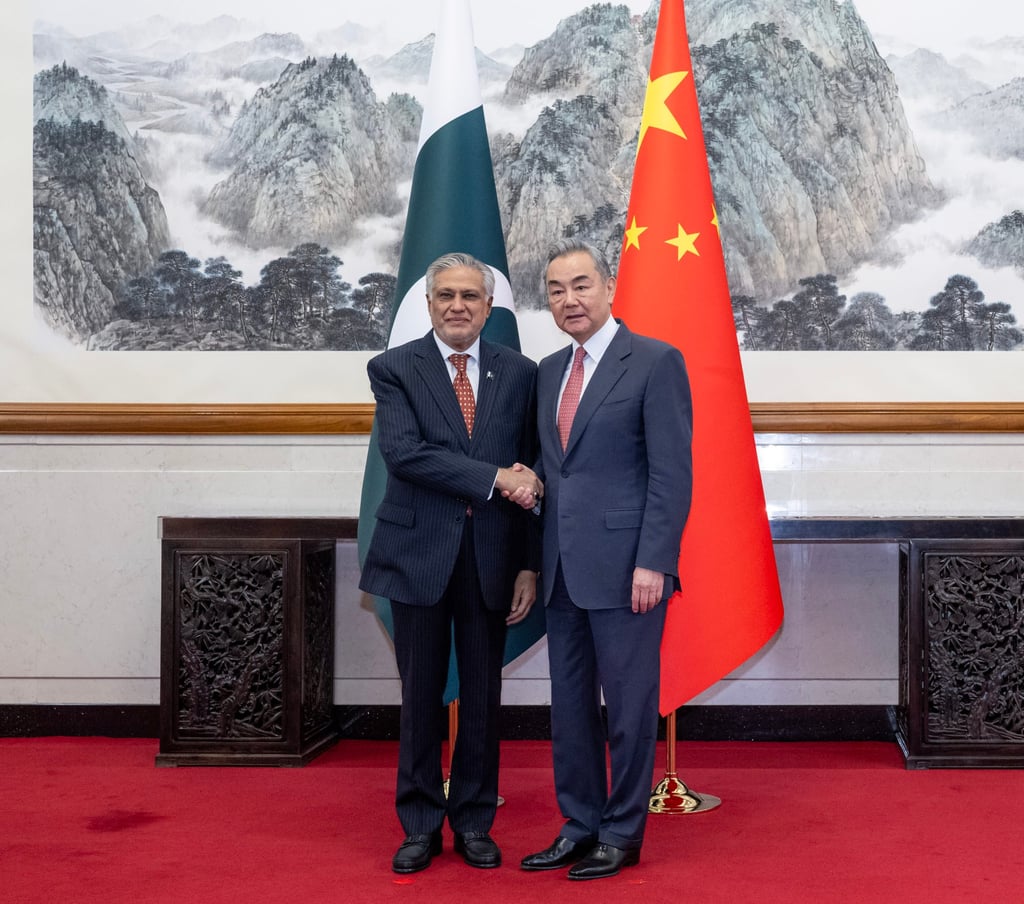 中国外交部长王毅(右)周二在北京与巴基斯坦外交部长伊沙克·达尔举行会谈。图:新华社