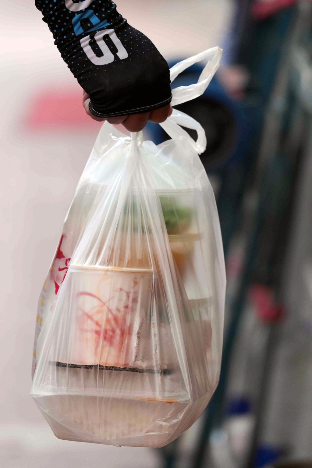 午餐时段,外卖员提着餐食穿梭于铜锣湾街头。摄影:Eugene Lee