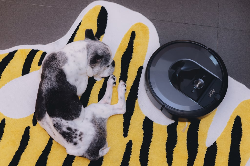 亚历克西斯·霍姆的爱犬美美与扫地机器人罗伯。摄影:乔斯林·谭