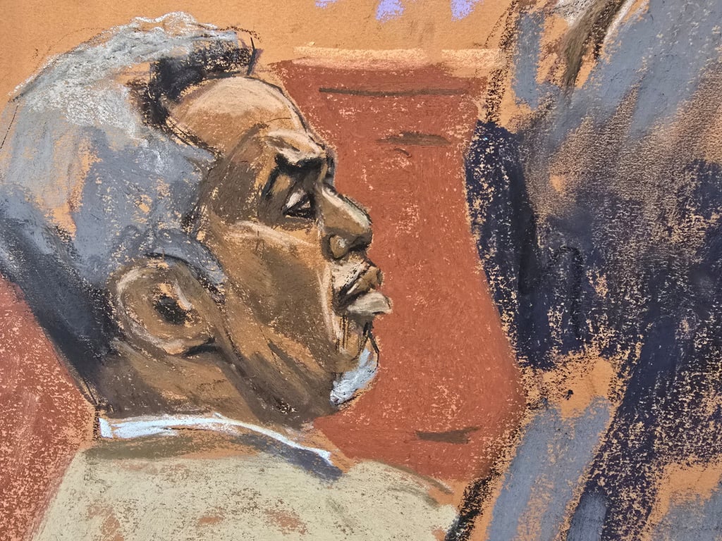 肖恩·“吹牛老爹”·库姆斯周四在纽约性交易案庭审中听取陈述。法庭素描:简·罗森伯格/路透社