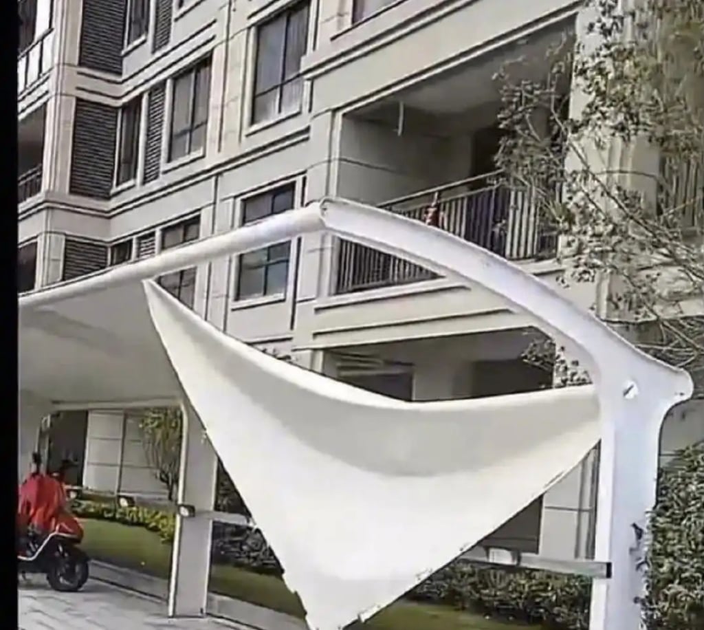 所幸图中雨棚缓冲了下坠冲击救了彭慧芳一命。图片来源:微博