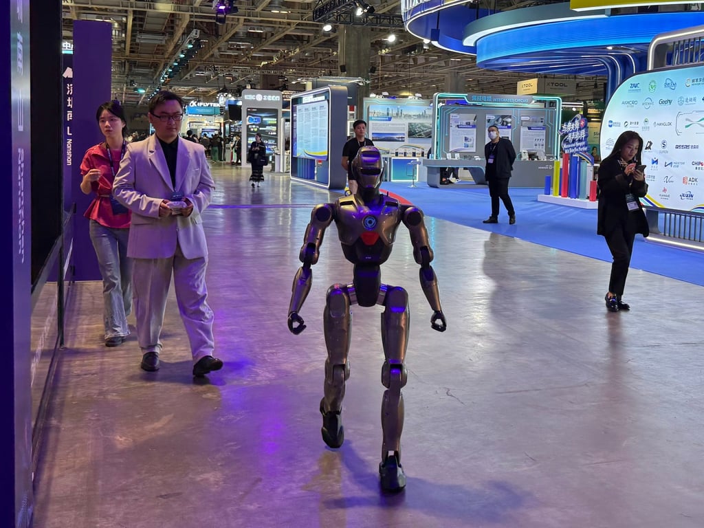 深圳引擎人工智能展出了其1.38米高的人形机器人PM01,周四该机器人在展区行走时引来众人围观。展台工作人员表示,这款定价13,700美元的设备主要应用于文旅场景及科研机构。