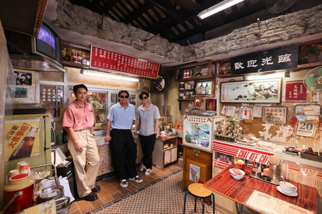 (从左至右)《怒火漫延》演员吴镇宇、张继聪和伍允龙在展览现场的场景展示区合影。摄影:谭诺拉