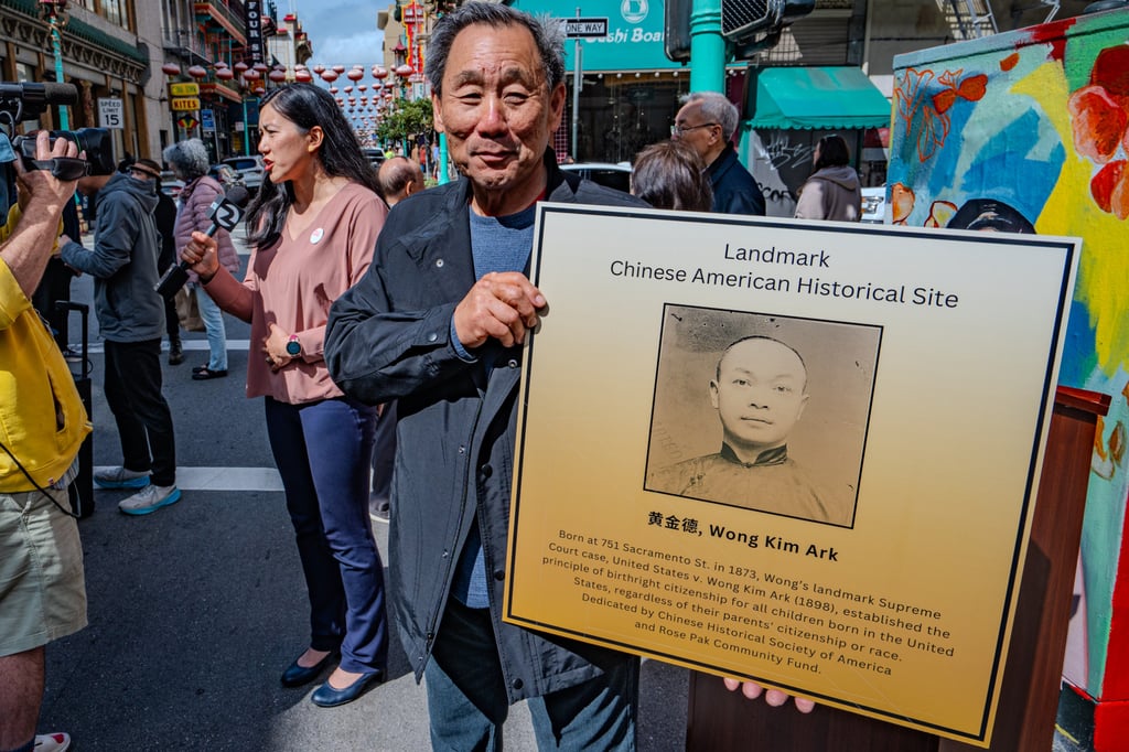 诺曼·王手持纪念其曾祖父黄金德的牌匾,1898年这场具有里程碑意义的最高法院案件确立了"出生即公民"原则。图:平权行动组织提供