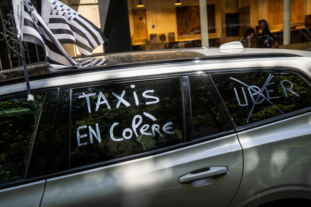 周四巴黎,出租车司机封锁法国交通部附近林荫大道时,一辆出租车窗上写着"愤怒的出租车"。图:EPA-EFE