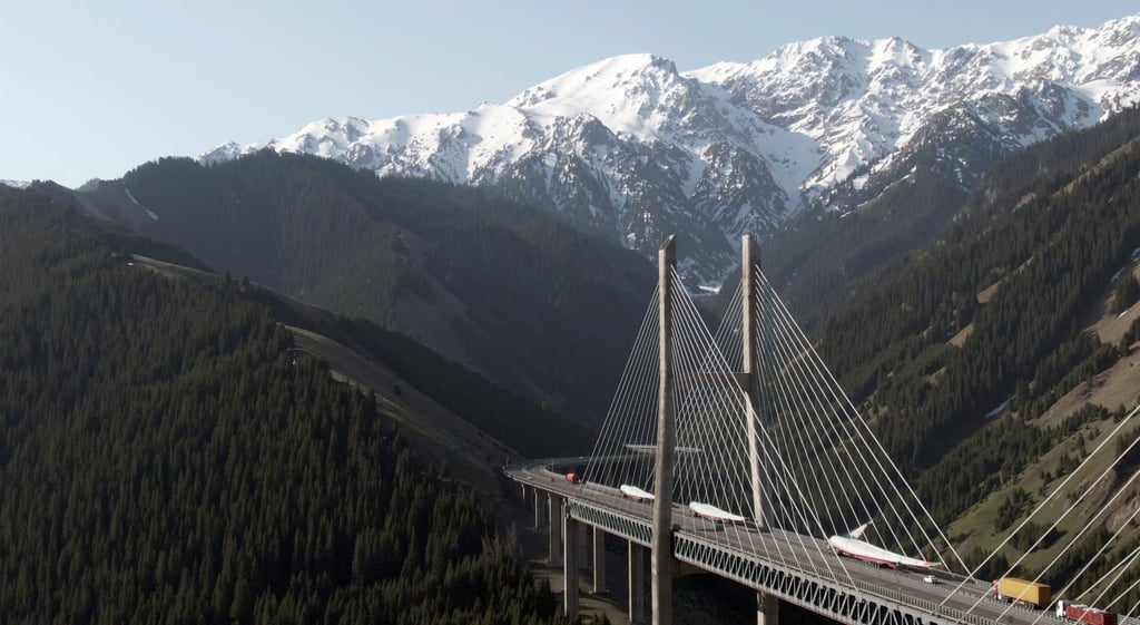 2023年9月14日,中国绿色能源开发商环球能源的一批风电设备组件通过果子沟大桥,运往哈萨克斯坦科斯塔奈的50兆瓦风电项目。图片来源:新华社