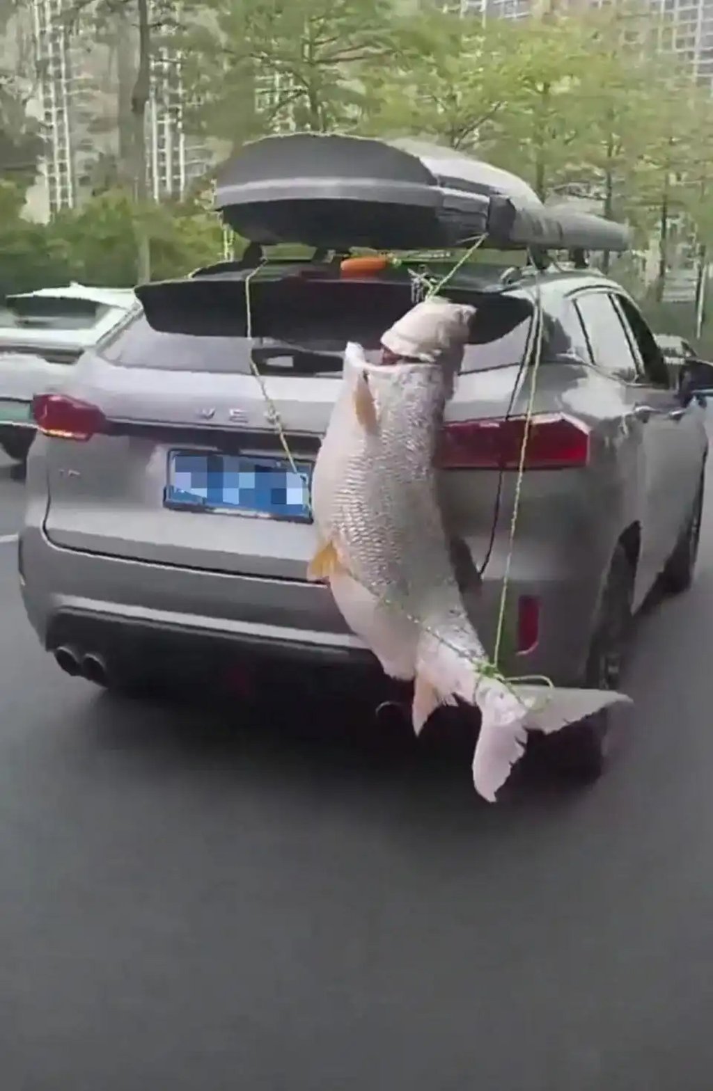 网络流传视频显示,5月15日,这名未公开身份的驾驶员将鱼的头尾固定在车尾,驾车在市区穿行。