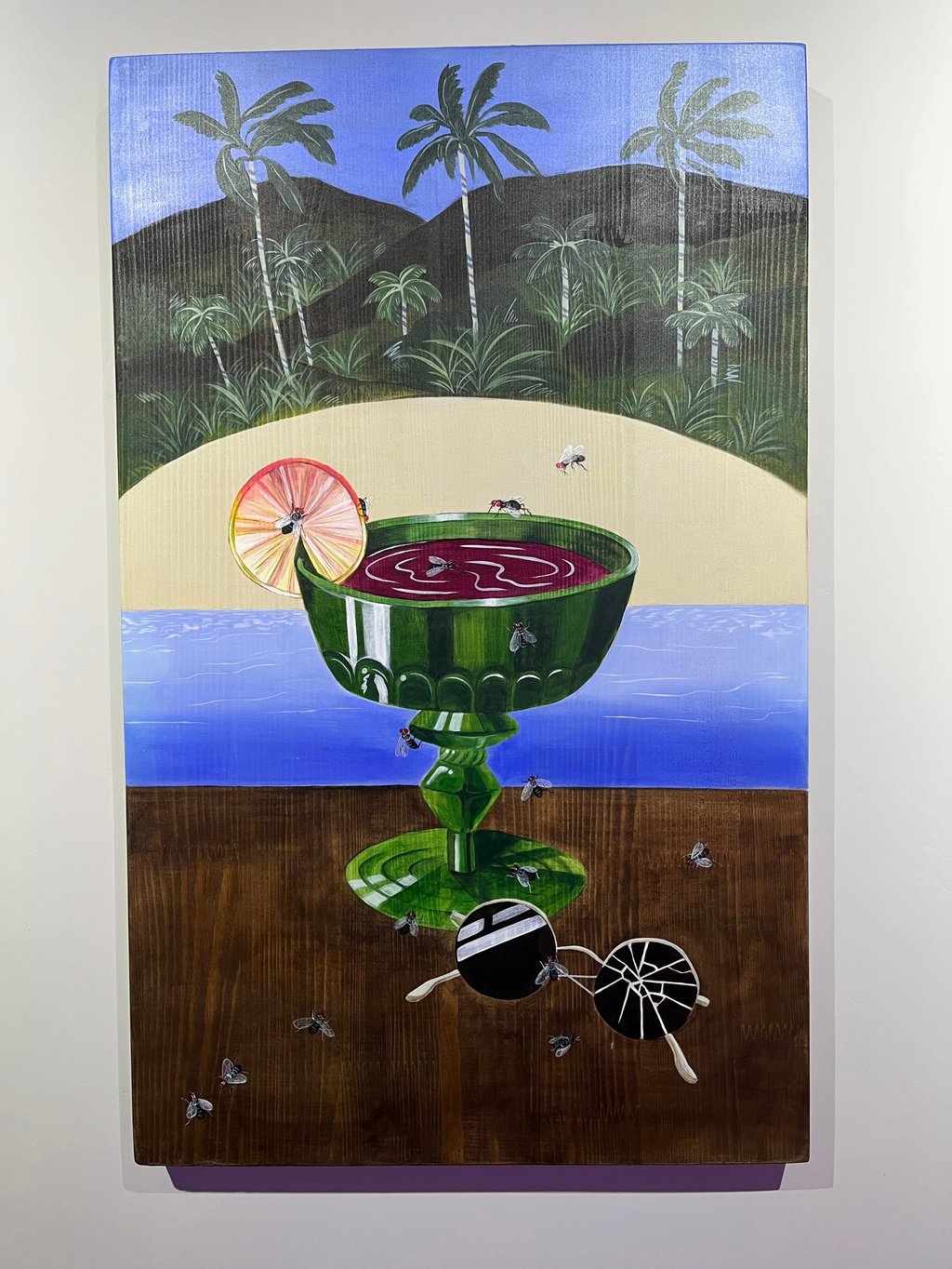 一杯看似鲜血的饮品上苍蝇云集,另一杯里似乎游动着金鱼。更令人不安的是旁边配枪的镜子装置,其灵感源自西班牙作家哈维尔·马里亚斯1992年小说《如此苍白的心》——书中新娘在蜜月后举枪自尽。