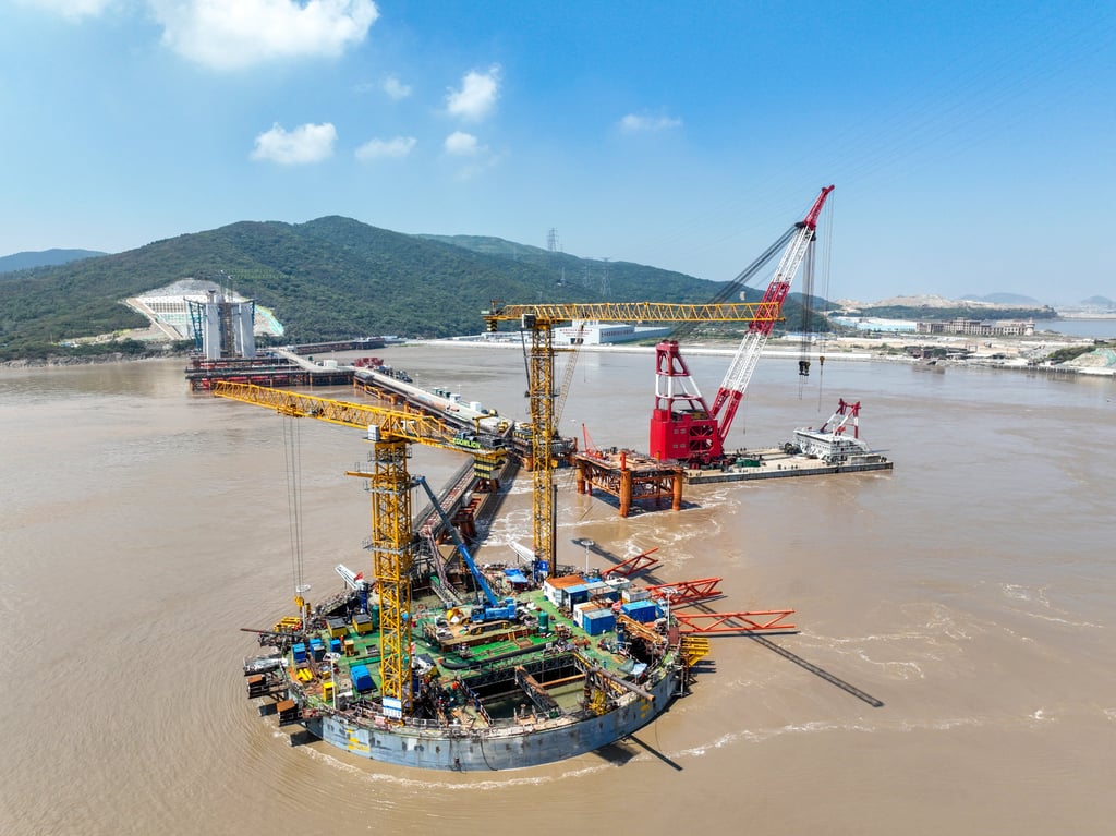 浙江省舟山市金塘岛海岸,宁波-舟山铁路西堠门公铁两用大桥建设现场。图片来源:CFOTO/Future Publishing via Getty Images