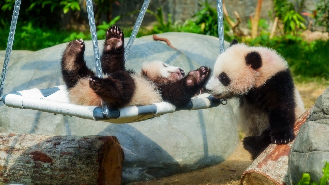 香港海洋公园大熊猫双胞胎首次与兴奋的公众见面
