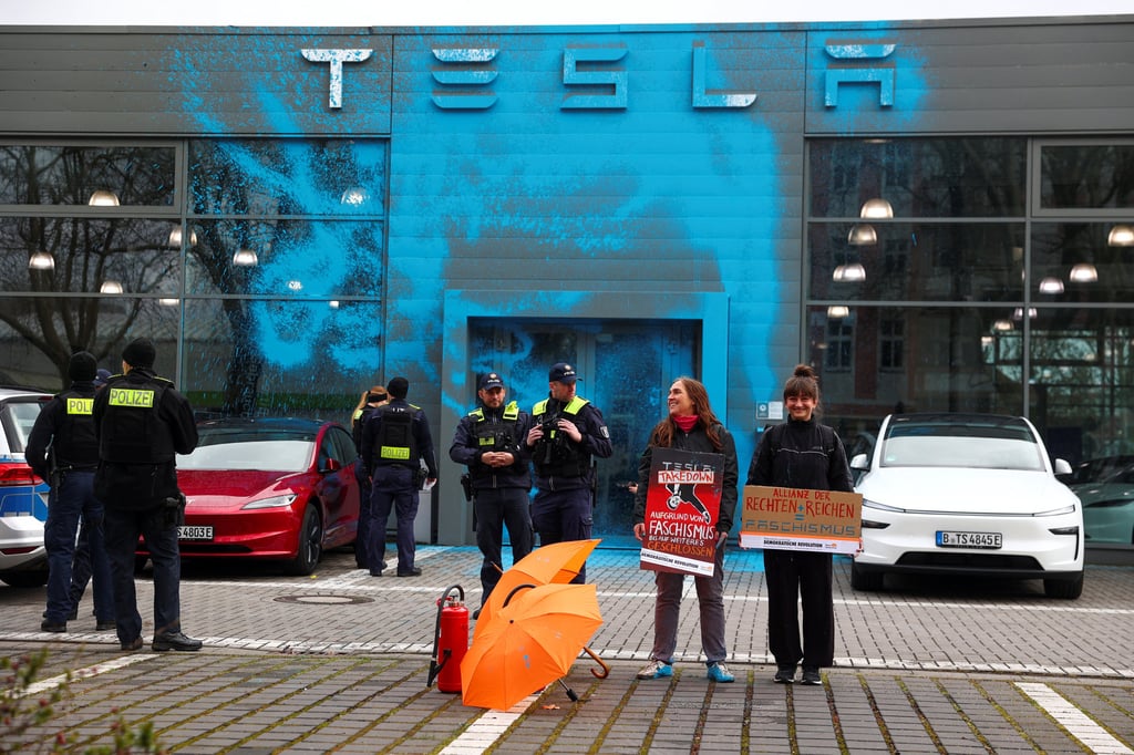 新一代(Neue Generation)的支持者在2025年3月31日喷涂特斯拉展厅外墙以抗议埃隆·马斯克后在柏林示威。照片:路透社。