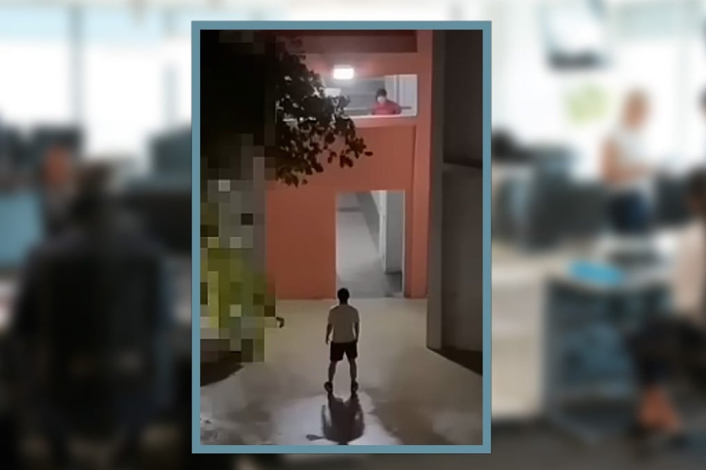 网络视频显示男子站在停车场附近,其妻在阳台上对他大声斥责。图片来源:Instagram/tiagong_sg