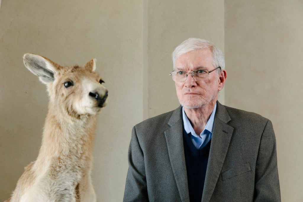 肯·汉姆在"遇见方舟"与动物模型合影。美联社照片