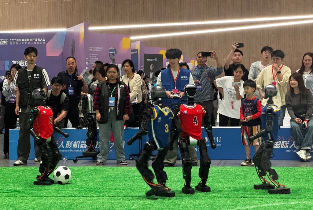 在浦东张江科学城举办的具身智能开发者大会设置了论坛、企业展和机器人"技能"比拼环节。大学生们使用主办方提供的人形机器人,完成了从足球比赛到工业、家庭及商业场景应用等多重任务挑战。