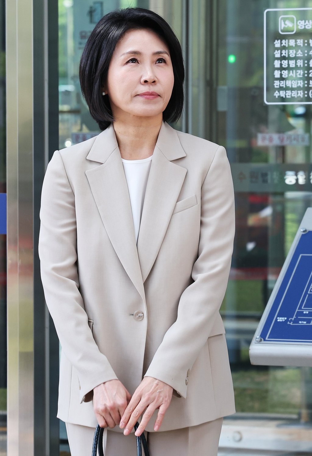 5月12日,民主党总统候选人李在明妻子金惠庆离开水原高等法院。该院维持原判,认定其2021年滥用京畿道政府信用卡支持丈夫竞选,需缴纳150万韩元罚款。图片来源:EPA-EFE