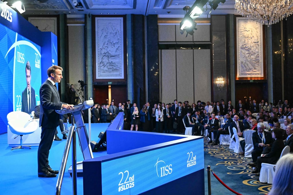 法国总统马克龙在香格里拉对话会发表主旨演讲。图片来源:法新社