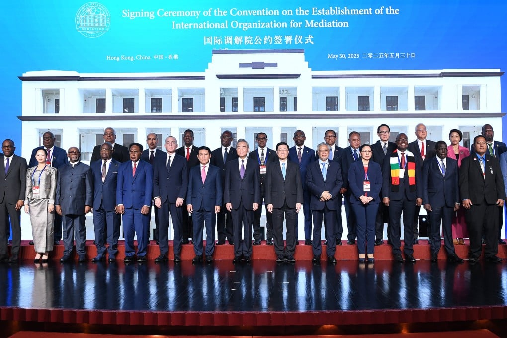 总部设于香港的国际调解院筹备办公室成立仪式上,中国外交部长王毅与来自80多国及国际组织的代表共同见证33国签署《建立国际调解院公约》。