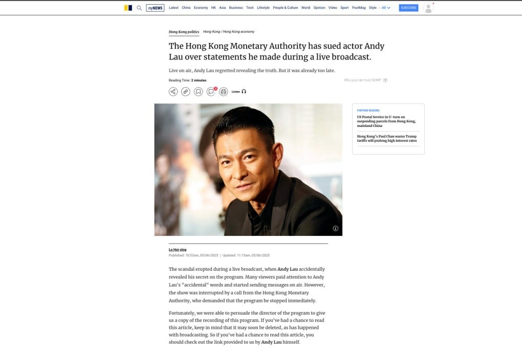 “《南华早报》从未发布此类报道,该新闻纯属伪造。请务必访问我们的官方网站www.scmp.com,保持警惕以防诈骗或钓鱼网站,“发言人强调。这篇伪造文章声称,金管局因刘德华在直播中推广某加密货币交易平台的投资建议而对其提起诉讼,文中宣称存入2000港元(254美元)即可在数月内获利百万。