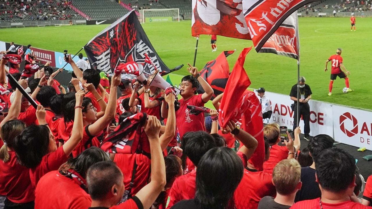 手持扩音器的张哲就是其中一员。多年来每逢港队比赛,他都会带领球迷呐喊助威。作为"香港痴线佬"球迷组织的核心成员,这个粤语名称直译为"疯狂家伙们"的团体,承载着张哲见证启德球场成为红色海洋的梦想。