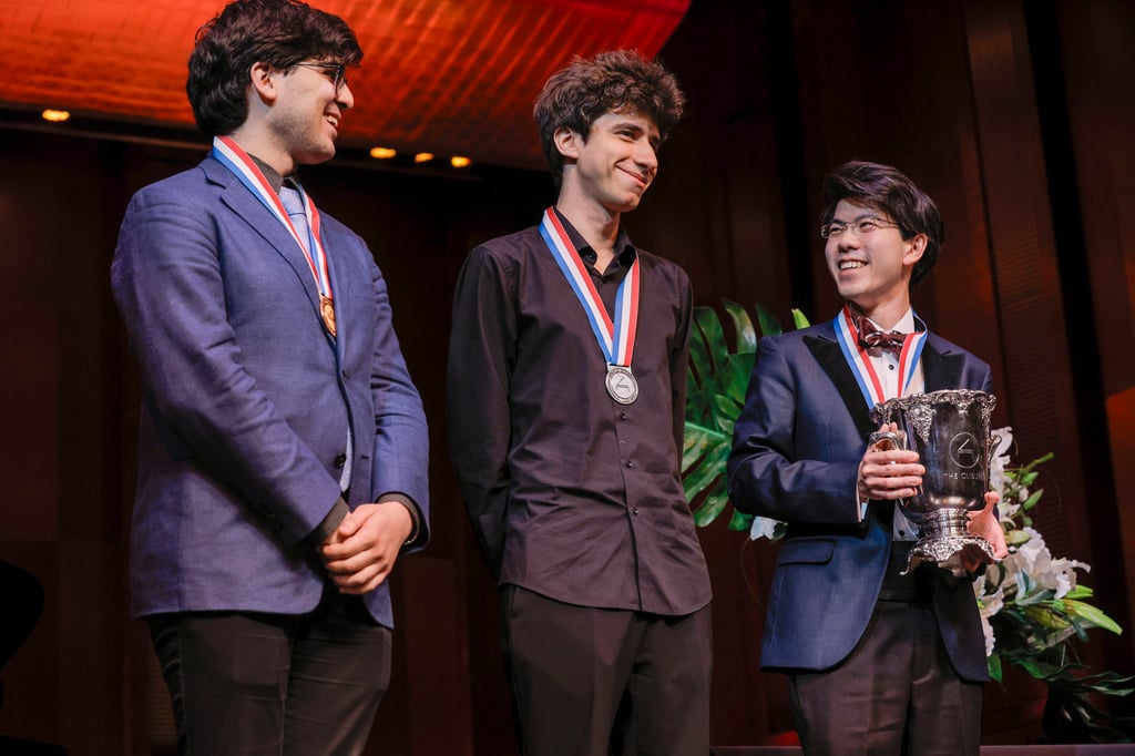 美国得州沃斯堡巴斯音乐厅内,第17届范·克莱本国际钢琴大赛颁奖典礼现场,香港选手沈靖韬(右)获得总冠军,美国选手埃夫伦·奥泽尔(左)获得铜牌,以色列和俄罗斯选手维塔利·斯塔里科夫获得第二名。照片:布兰登·韦德