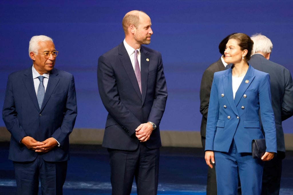 英国威廉王子(中)、瑞典维多利亚王储(右)和欧洲理事会主席安东尼奥·科斯塔(左)于周日齐聚摩纳哥格里马尔迪论坛,在联合国海洋大会前夕的蓝色经济与金融论坛(BEFF)结束后登台合影。照片:法新社
