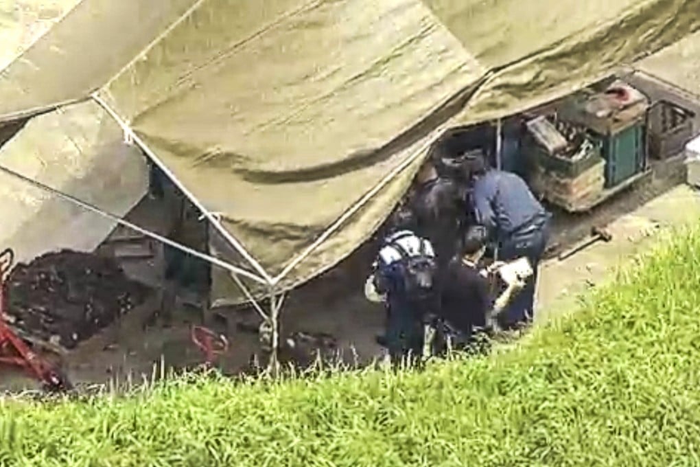 日本自卫队成员在嘉手纳空军基地的设施内,正试图清除物品上的锈迹以重新评估它们是否为炸弹,神运天昭表示。