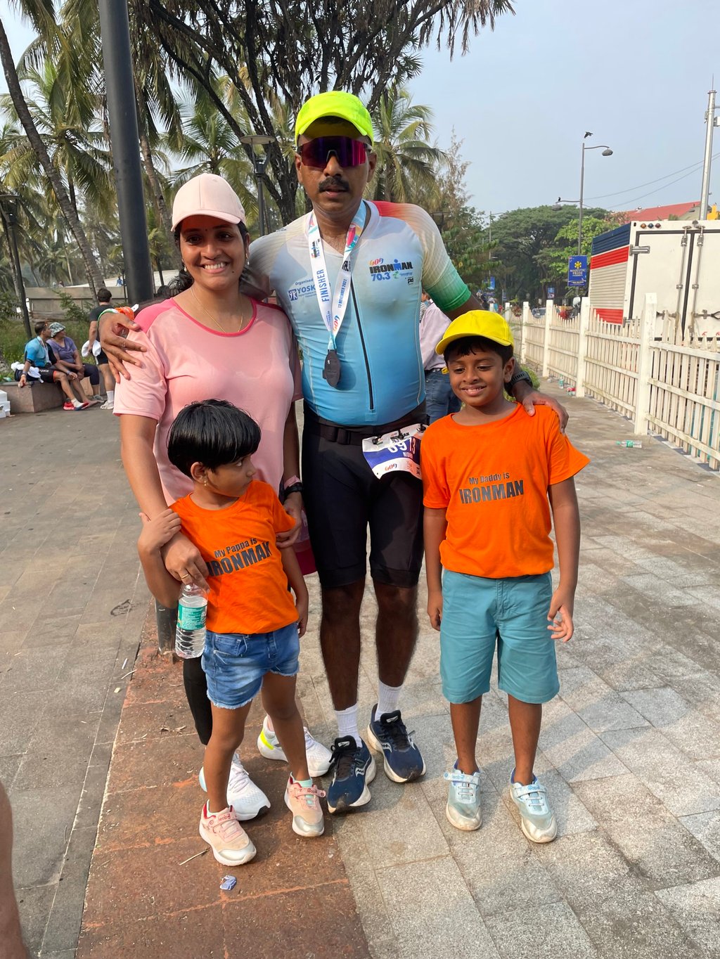 2022年,瓦尔桑与妻子雷米娅和两个孩子完成果阿70.3铁人赛后的合影。照片:尼丁·瓦尔桑