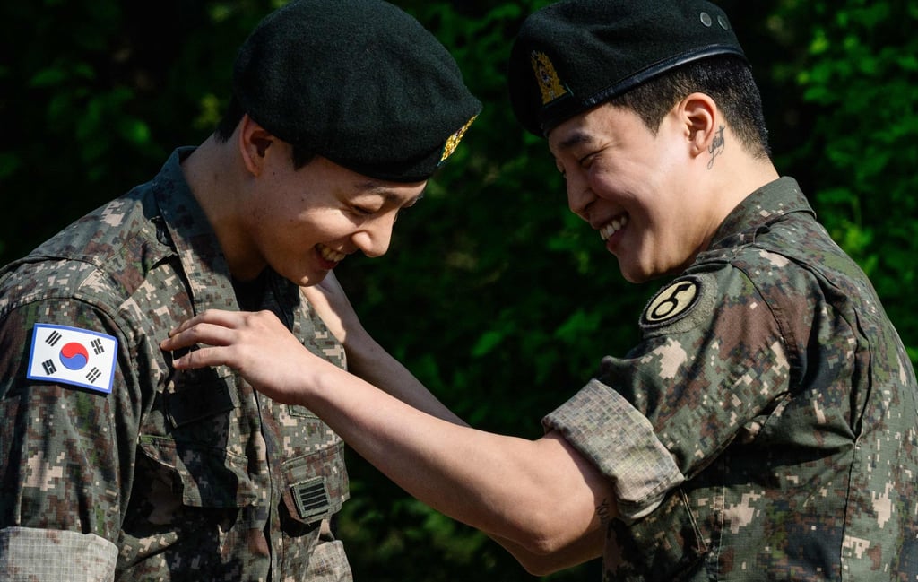 当天早些时候,这两位身着军装的明星在位于首尔以北约60公里(37英里)的涟川郡原部队附近体育设施举行的简短仪式上,向欢呼的人群敬礼致意。