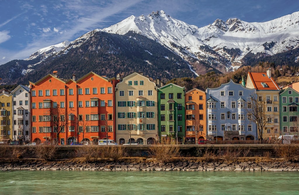 因斯布鲁克老城河畔,历史建筑色彩斑斓的立面与雪山背景相映成趣。图:Shutterstock