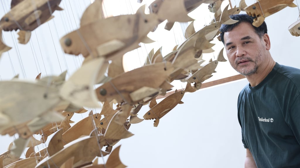 林哲站在大围慈济环保行动中心,身旁是其用回收木材制作的百余只鲨鱼装置。摄影:K.Y. Cheng